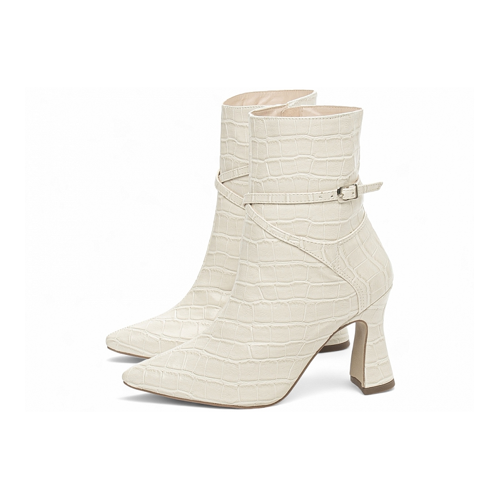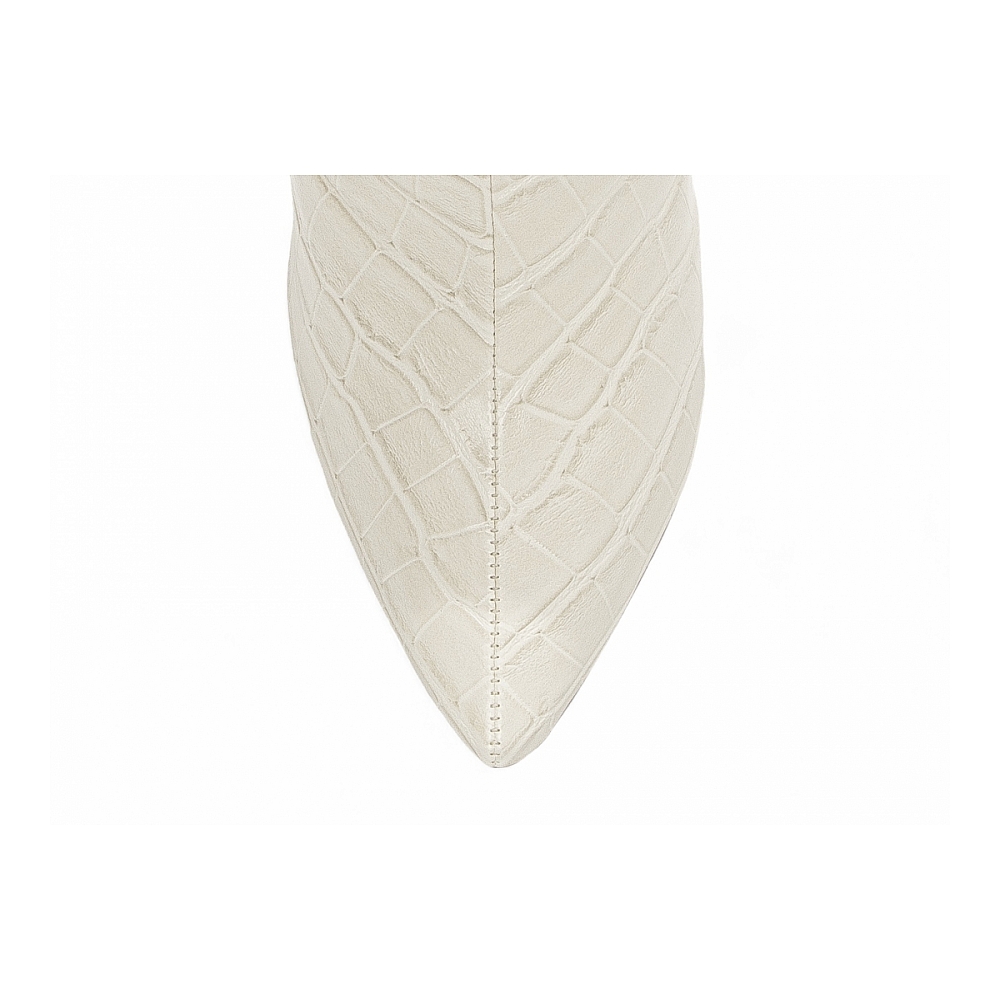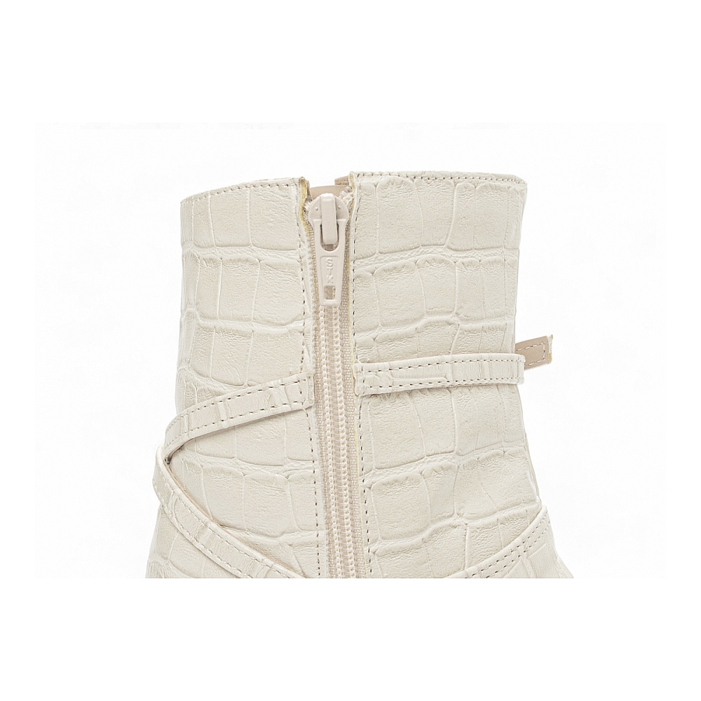 Material: Napa Croco Off White; Enfeites: Zíper na Cor Off White (lateral interna) fivela na cor Prata; Palmilha: 8 mm de Espessura, Espuma em EVA, e Taloneira Napa Bege; Forro: Cacharrel, material espumado para maior conforto, na cor Bege; Salto: 9 cm de Altura e Revestido em Napa Croco Off White; Solado em Micro na cor Bege.