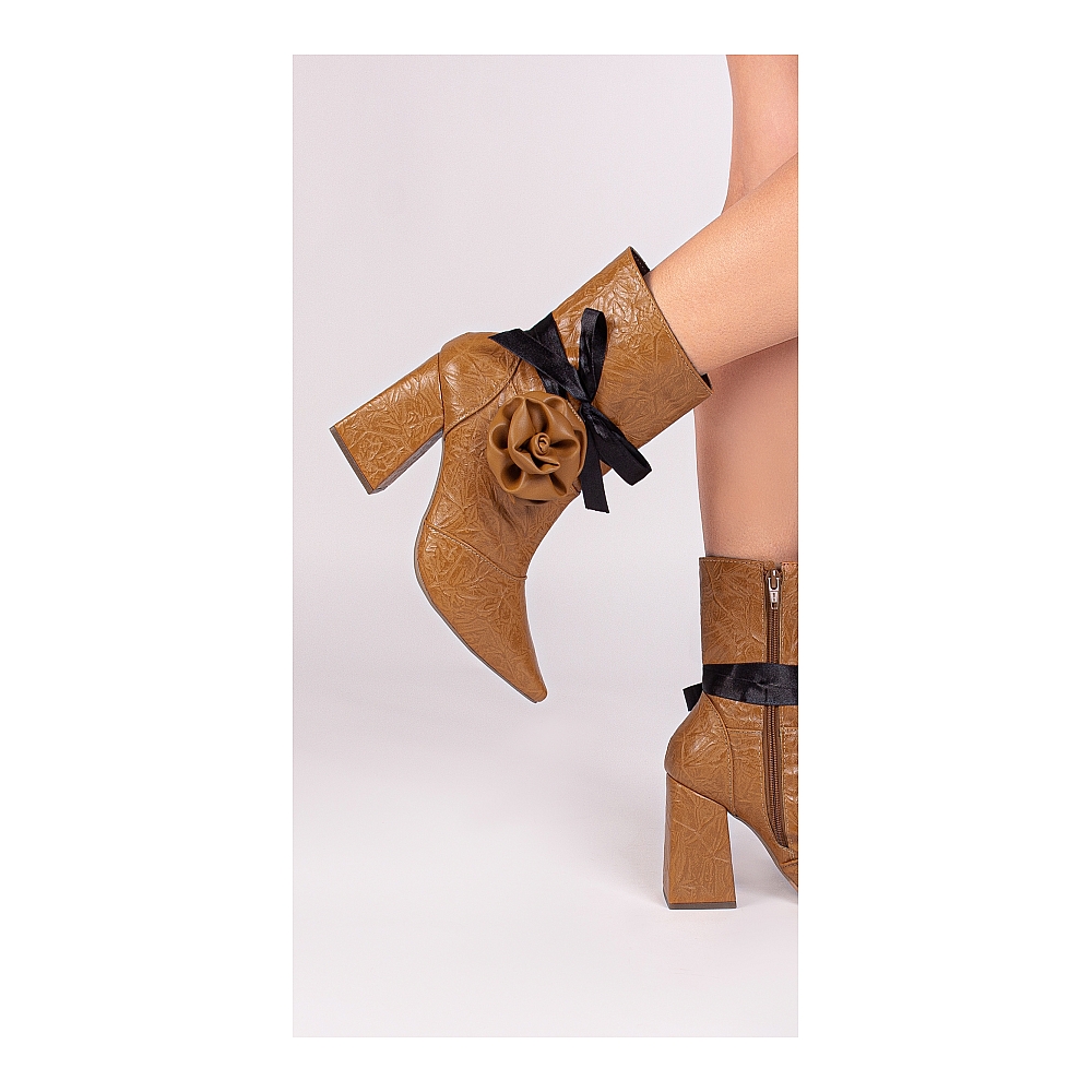 Material: Napa Vintage Caramelo; Enfeites: Zíper na Cor Caramelo (lateral interna) e Pulseira Removível com Flor em Napa Caramelo e tira em Cetim Preto; Palmilha: 8 mm de Espessura, Espuma em EVA, e Taloneira Napa Preto; Forro: Cacharrel, material espumado para maior conforto, na cor Café; Salto: 9 cm de Altura e Revestido em Napa Vintage Caramelo; Solado em PVC na cor Bege.