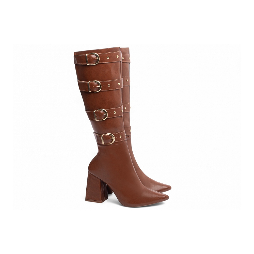 Material: Napa Caramelo; Enfeites: Zíper na Cor Caramelo, Fivelas e Apliques na Cor Dourado; Palmilha: 8 mm de Espessura, Espuma em EVA, e Taloneira Napa Preto; Forro: Cacharrel, material espumado para maior conforto, na cor Marrom Café; Salto: 9 cm de Altura e Revestido em Napa na cor Caramelo; Solado de TR na cor Bege.