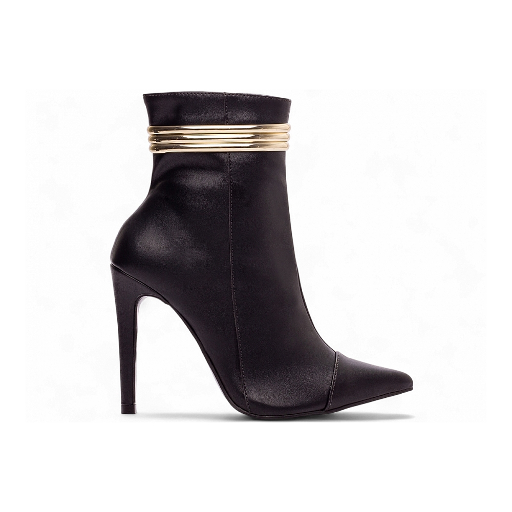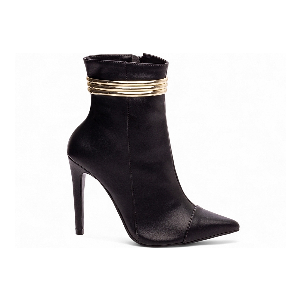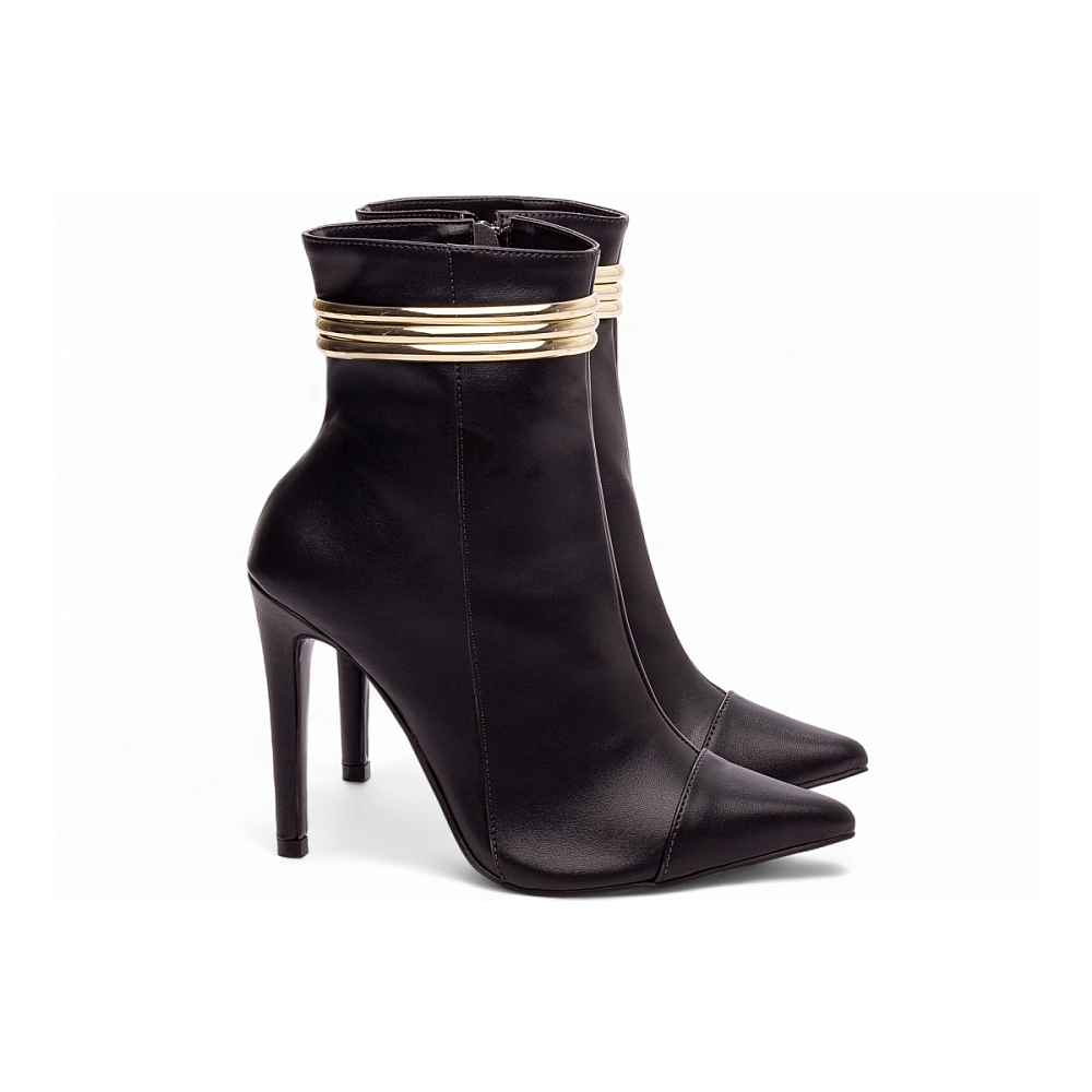 Material: Napa Preto; Enfeites: Zíper na Cor Preto (lateral interna) e tiras em Dourado; Palmilha: 8 mm de Espessura, Espuma em EVA, e Taloneira Napa Preto; Forro: Cacharrel, material espumado para maior conforto, na cor Preto; Salto: 12 cm de Altura e Revestido em Napa Preto; Solado em Micro na cor Preto.