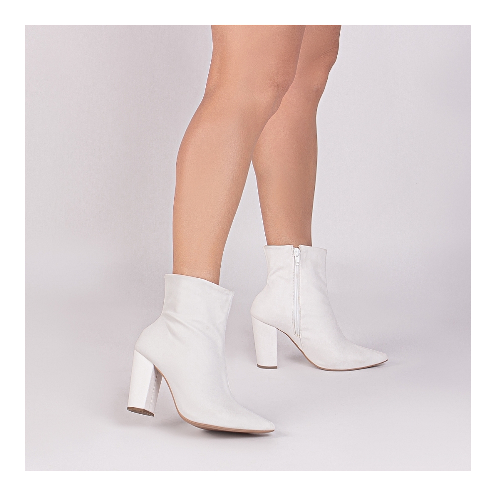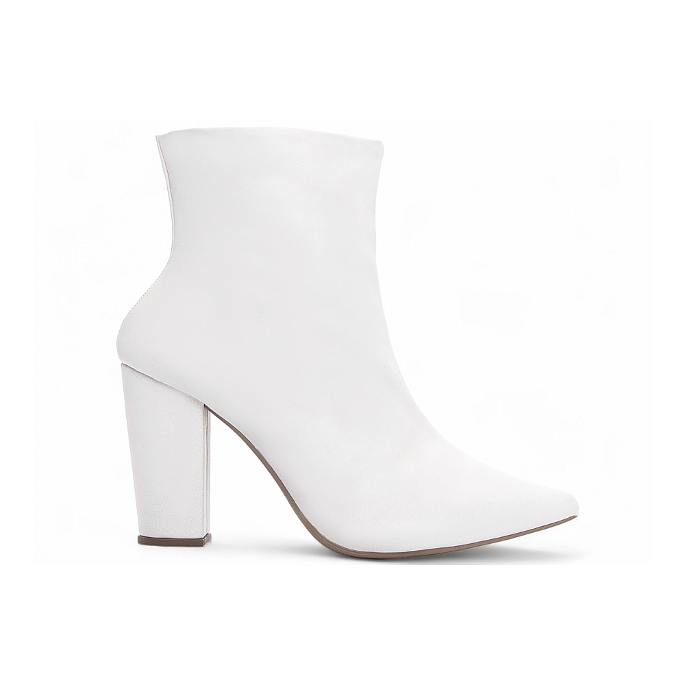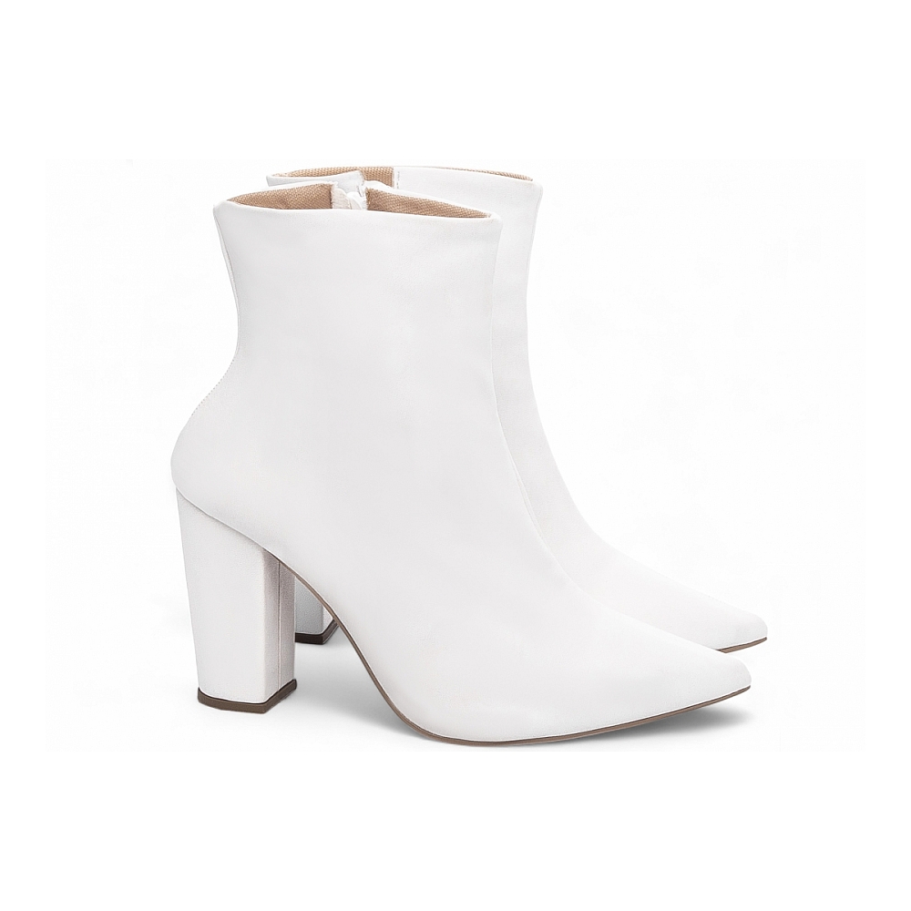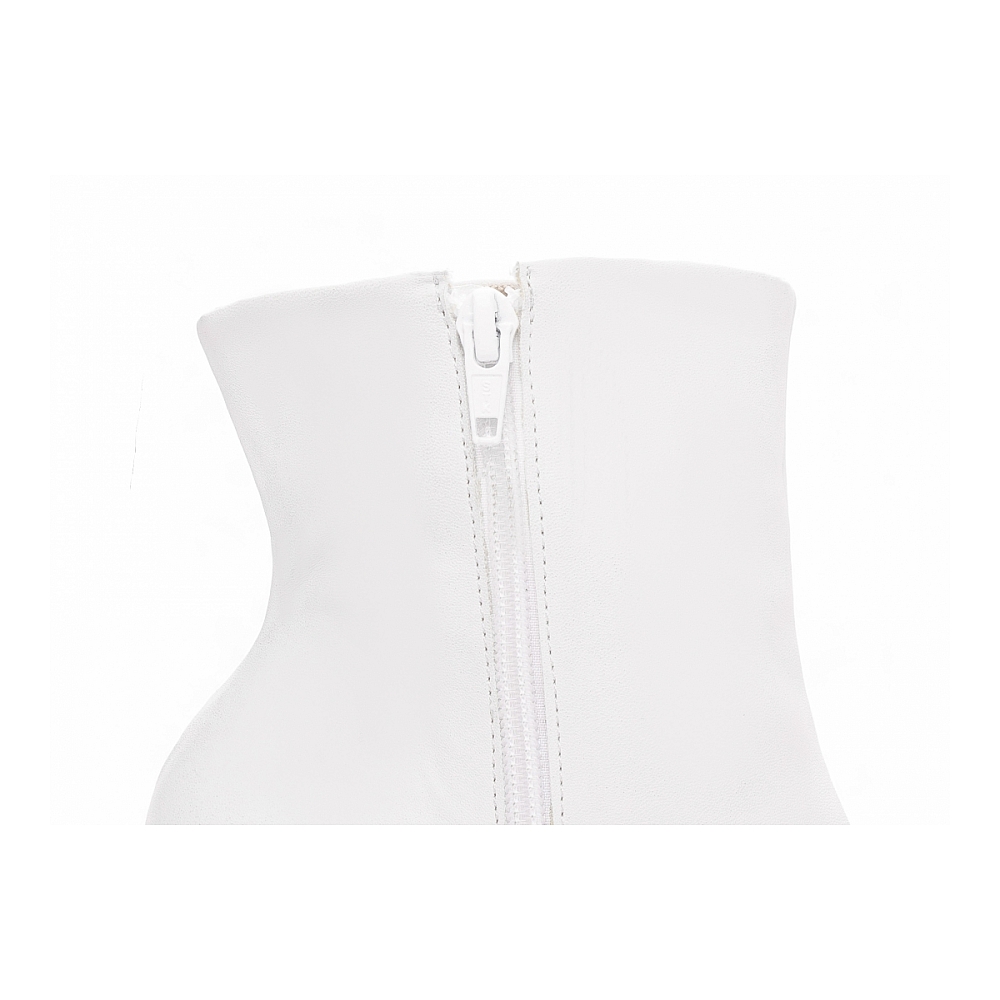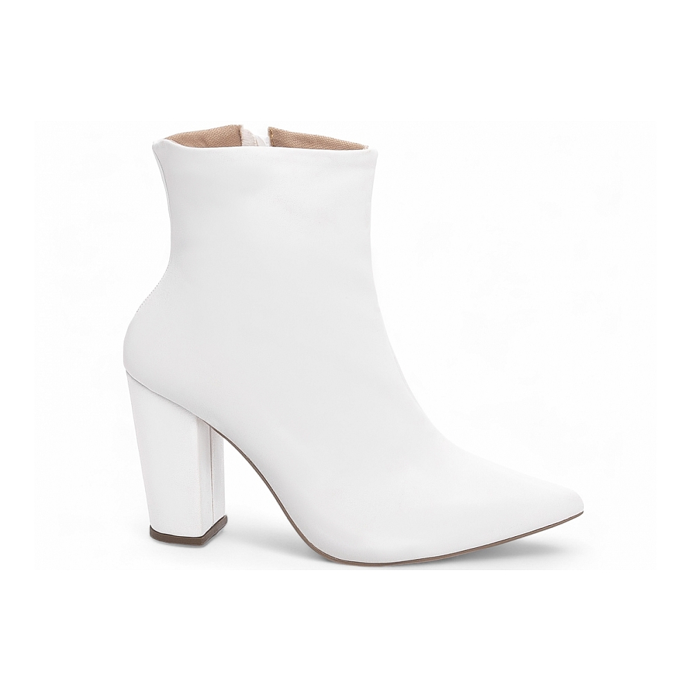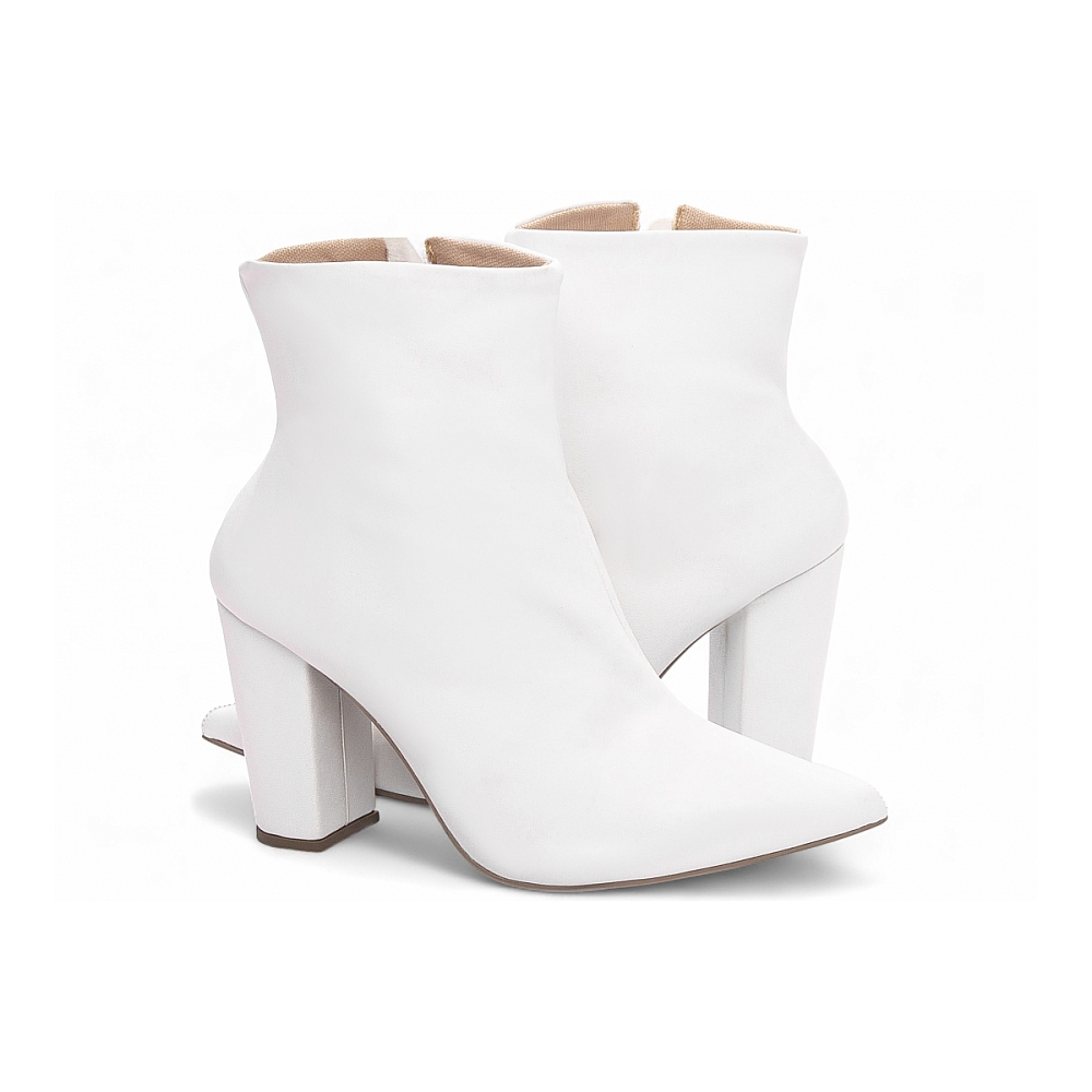 Material: Napa Branco; Enfeites: Zíper na cor Branco (lateral interna); Palmilha: 8 mm de Espessura, Espuma em EVA, e Taloneira Napa Preto; Forro: Cacharrel, material espumado para maior conforto na cor Bege; Salto: 9 cm de Altura encapado em Napa Branco; Solado de PVC na cor Bege.