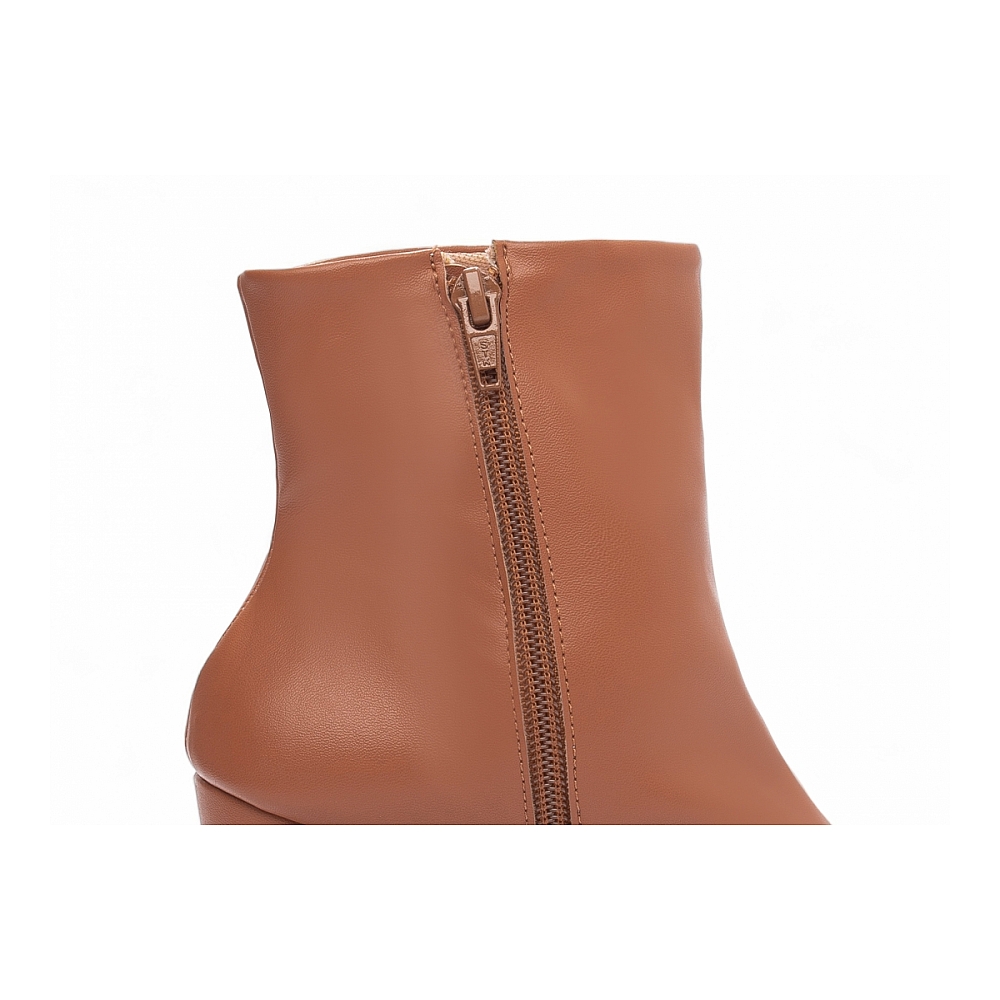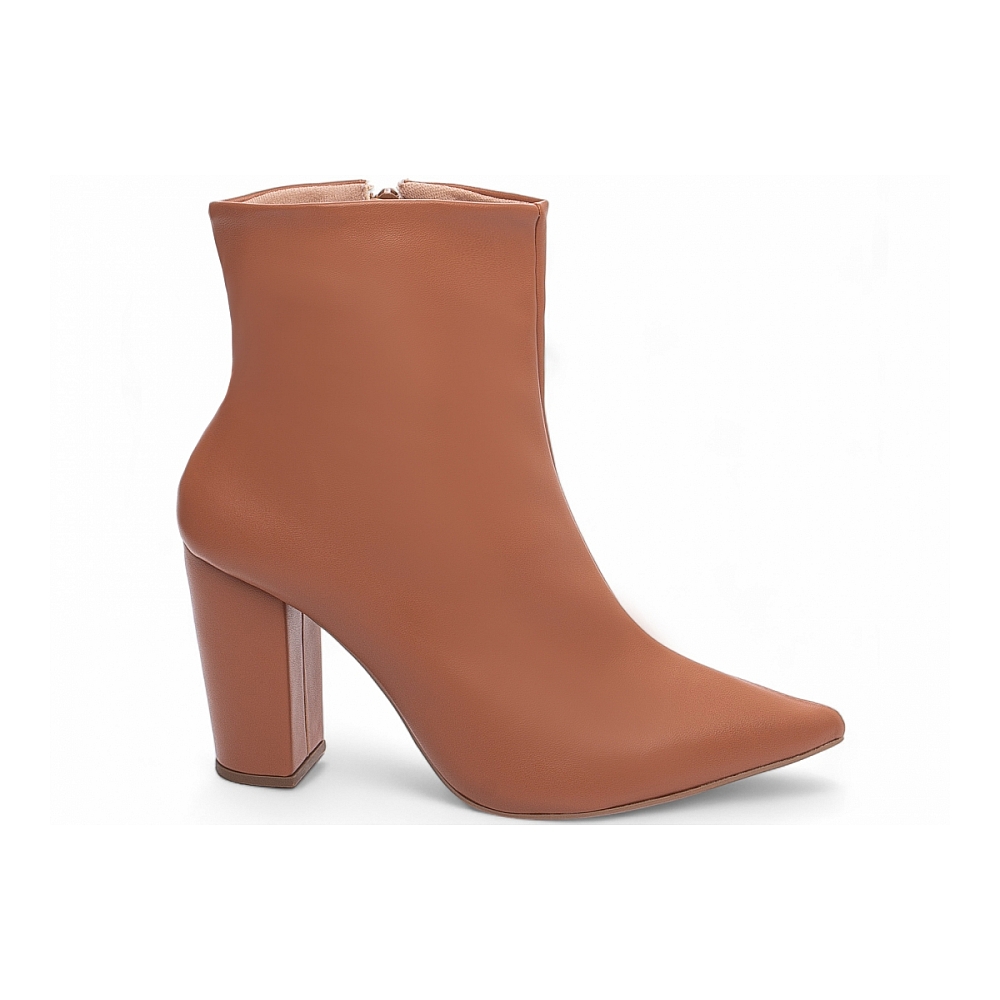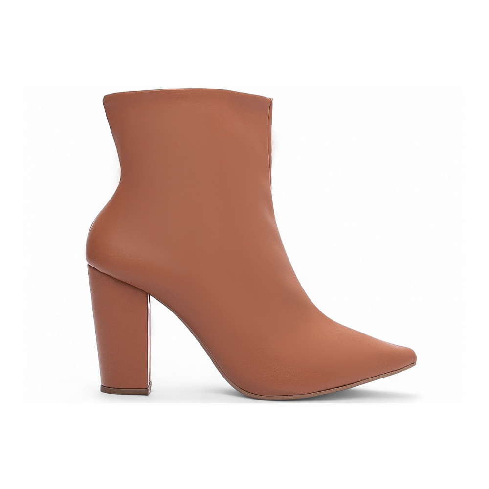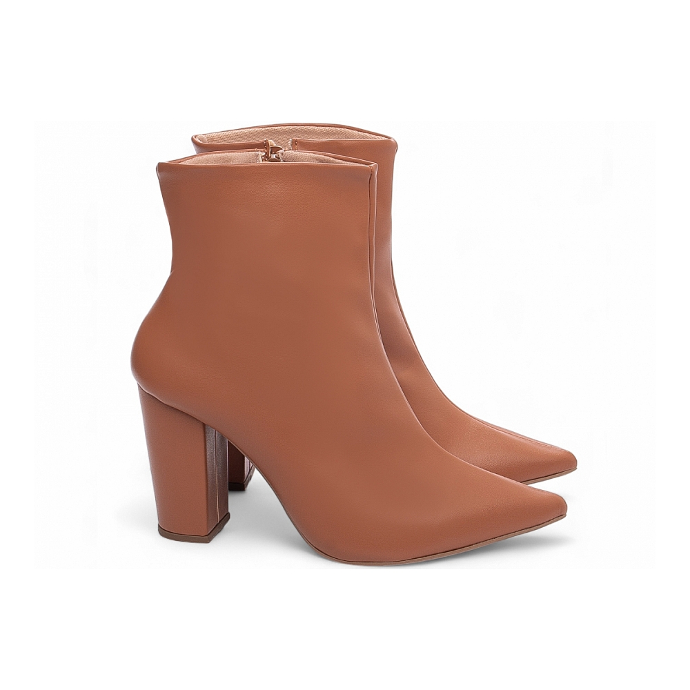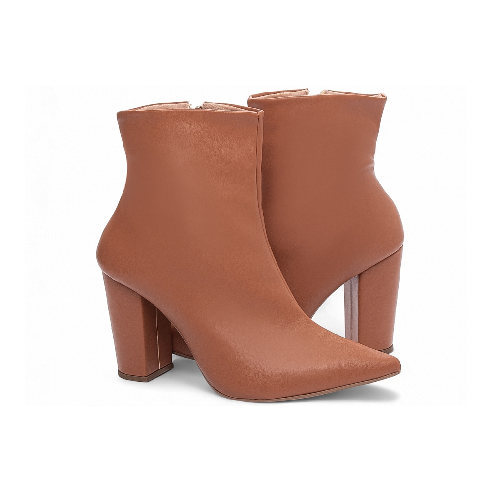 Material: Napa Caramelo; Enfeites: Zíper na cor Caramelo (lateral interna); Palmilha: 8 mm de Espessura, Espuma em EVA, e Taloneira Napa Preto; Forro: Cacharrel, material espumado para maior conforto na cor Bege; Salto: 9 cm de Altura encapado em Napa Caramelo; Solado de PVC na cor Bege.