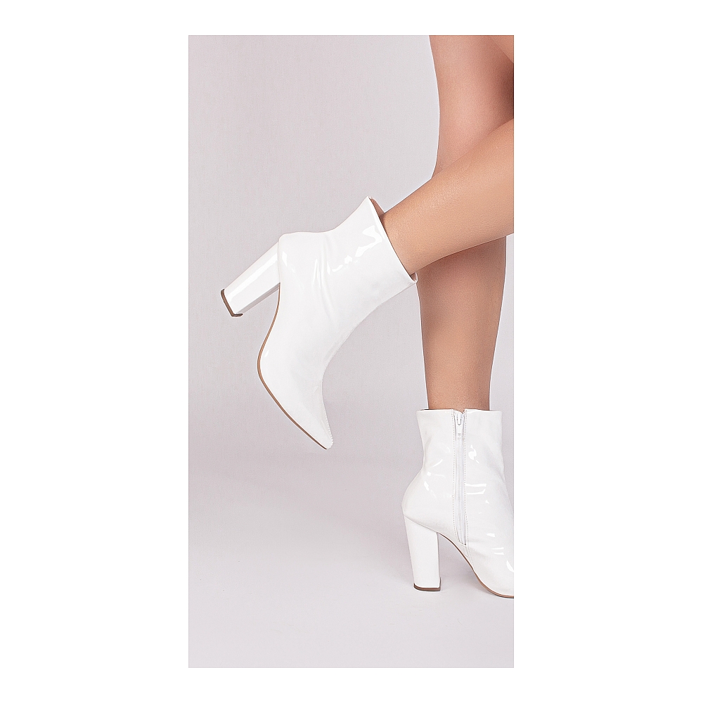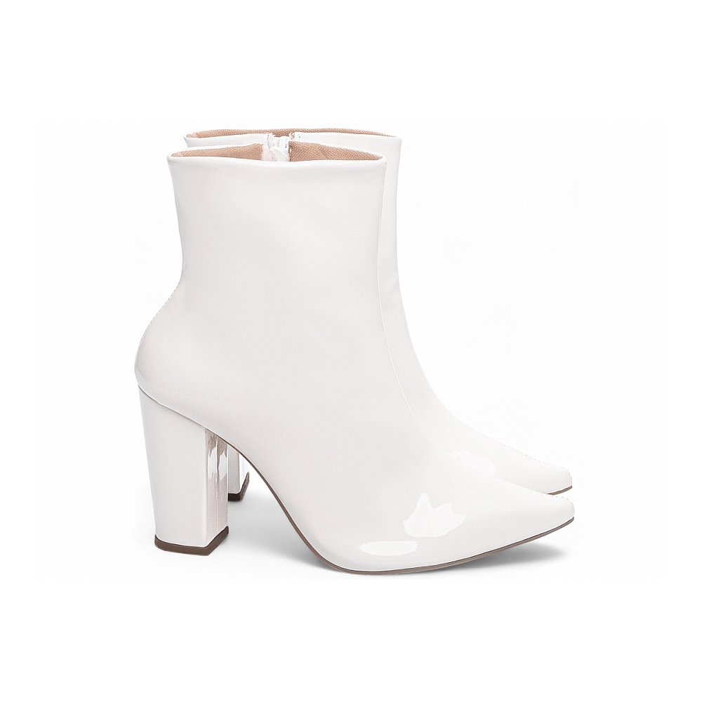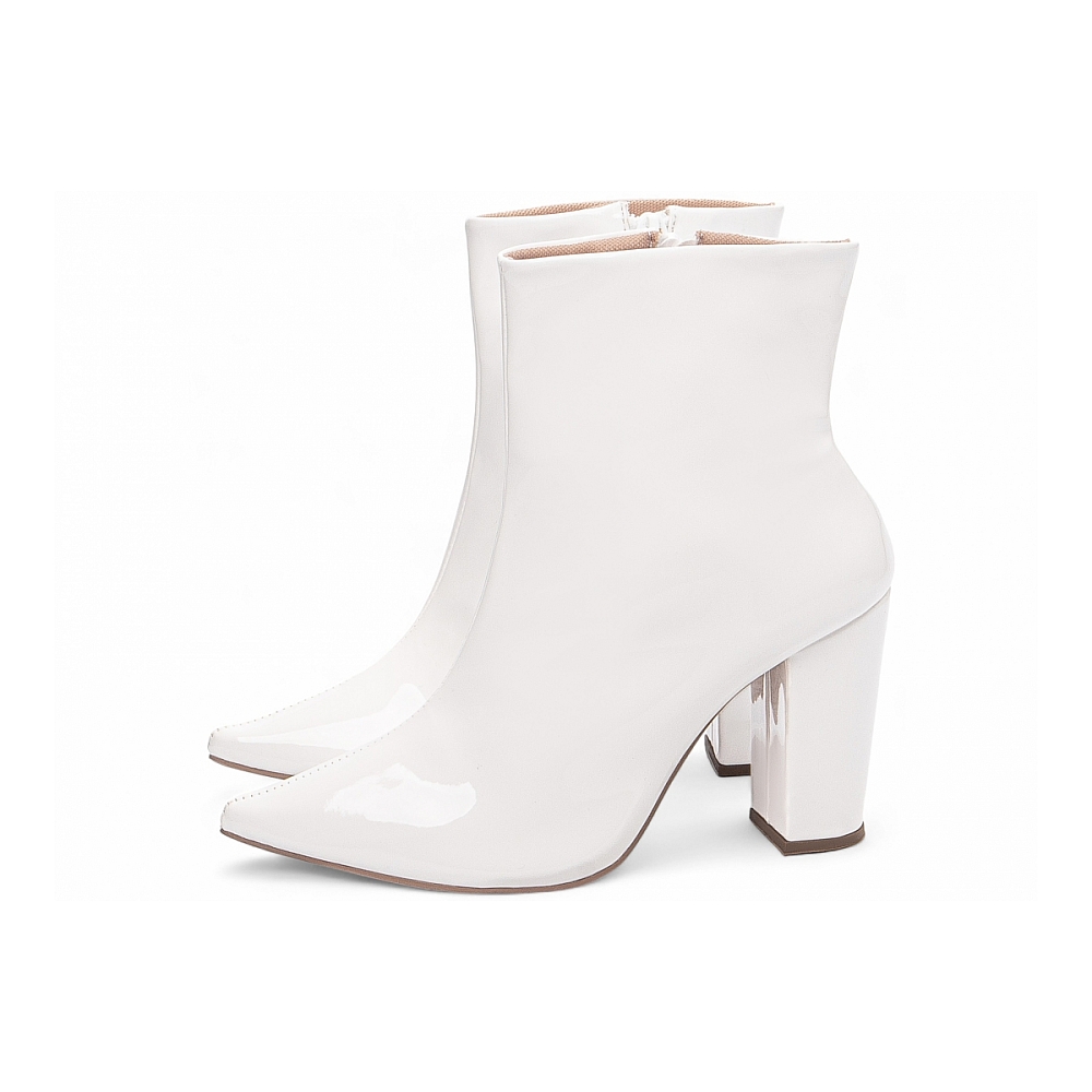 Material: Verniz Branco; Enfeites: Zíper na cor Branco (lateral interna); Palmilha: 8 mm de Espessura, Espuma em EVA, e Taloneira Napa Preto; Forro: Cacharrel, material espumado para maior conforto na cor Bege; Salto: 9 cm de Altura encapado em Verniz Branco; Solado de PVC na cor Bege.