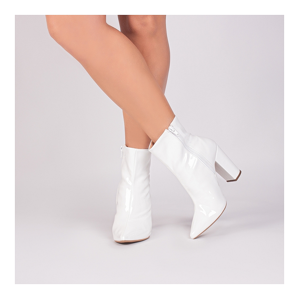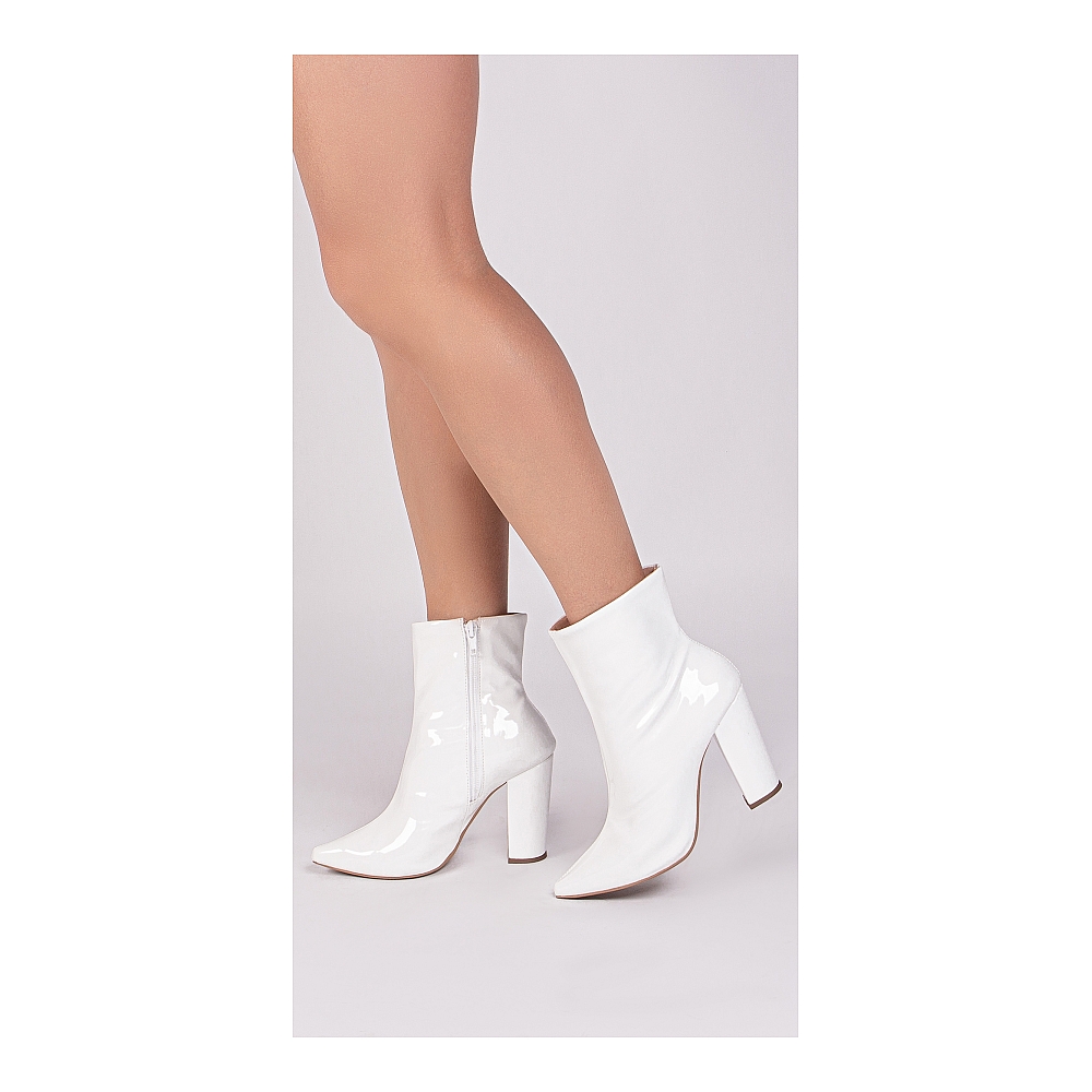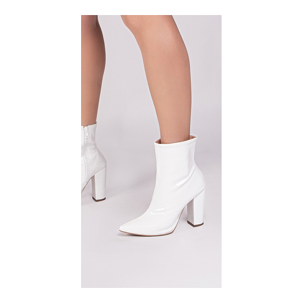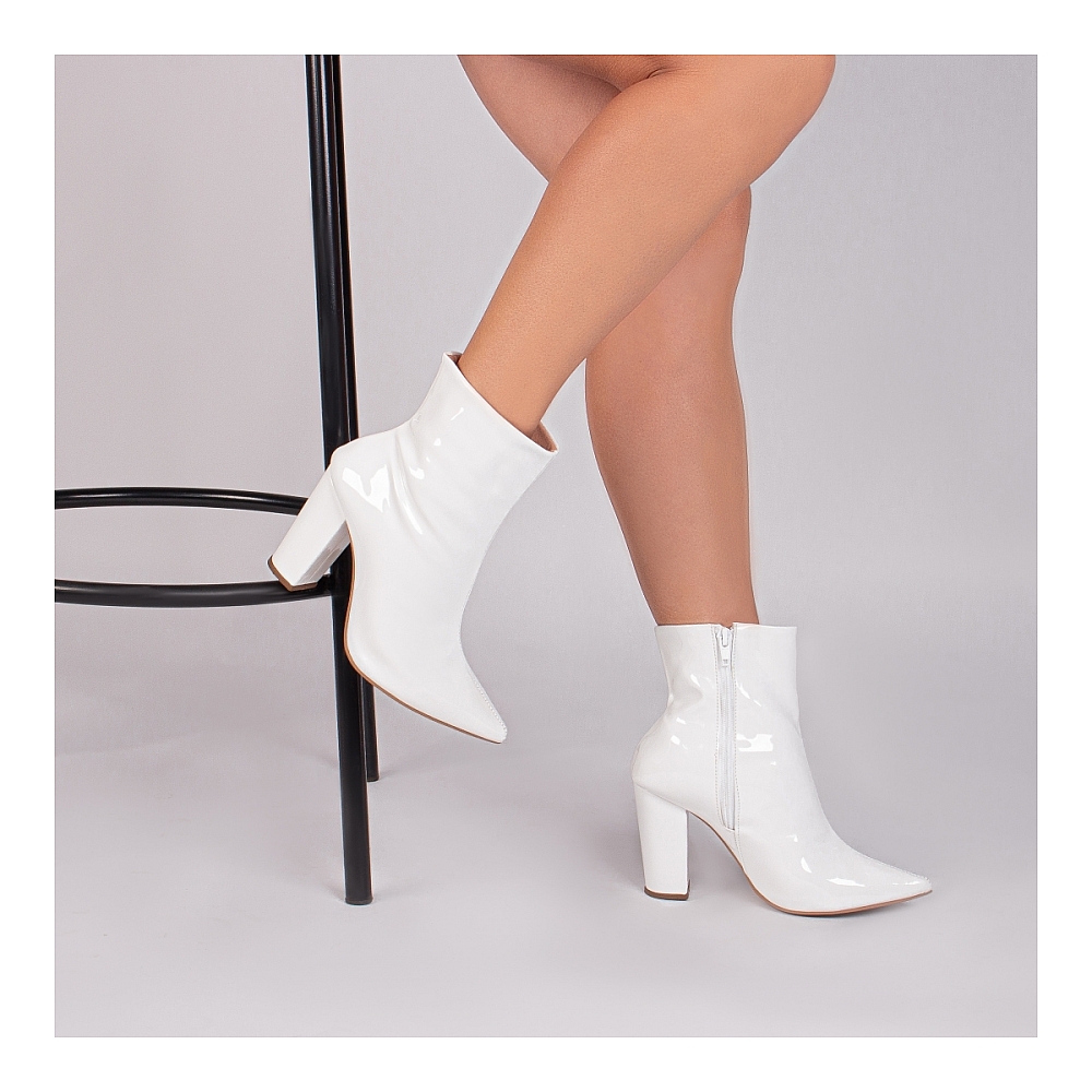 Material: Verniz Branco; Enfeites: Zíper na cor Branco (lateral interna); Palmilha: 8 mm de Espessura, Espuma em EVA, e Taloneira Napa Preto; Forro: Cacharrel, material espumado para maior conforto na cor Bege; Salto: 9 cm de Altura encapado em Verniz Branco; Solado de PVC na cor Bege.