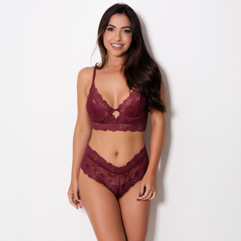 Conjunto desenvolvido em renda de poliamida. Sutiã com lindo detalhe no decote, confeccionado sem bojo, com aro e forro. Alças com ajustes de altura em metais e fechamento traseiro com colchete de dois níveis. Calcinha cintura alta asa delta toda em renda, com forro 100% algodão, modela o corpo e seus detalhes ficam incríveis.