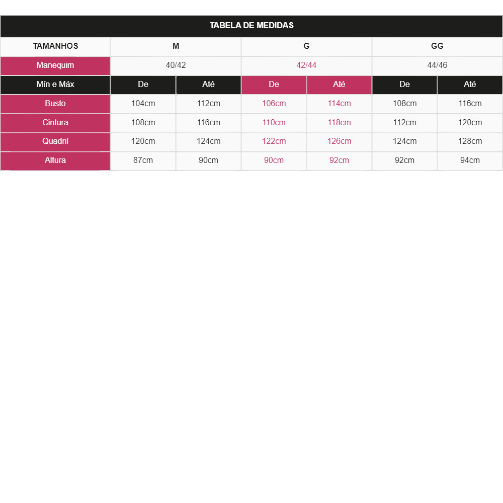 Composição: Tecido: 96% Poliéster; 04% Elastano; Renda: 90% Poliamida; 10% Elastano.