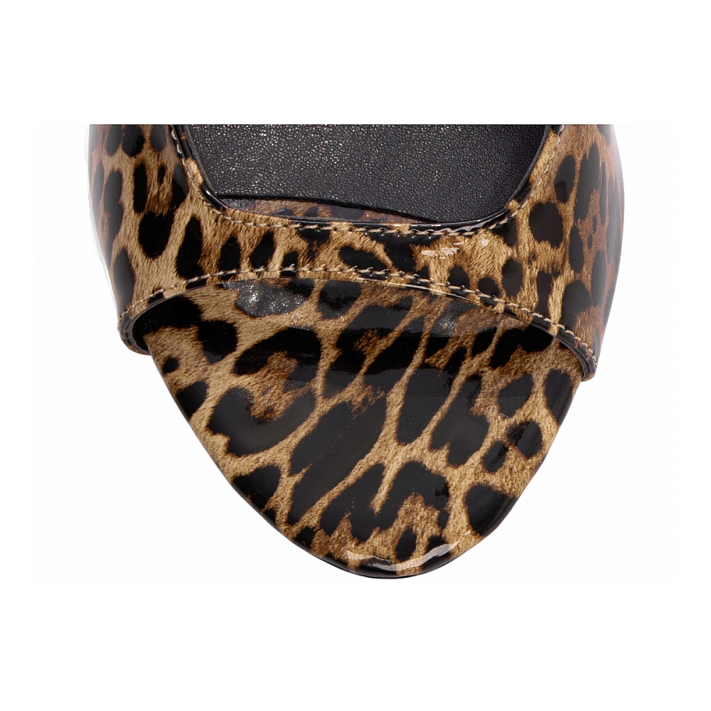 Palmilha: 8 mm de Espessura, Espuma em EVA, Revestida em Verniz estampado Onça e Taloneira Napa Preto;