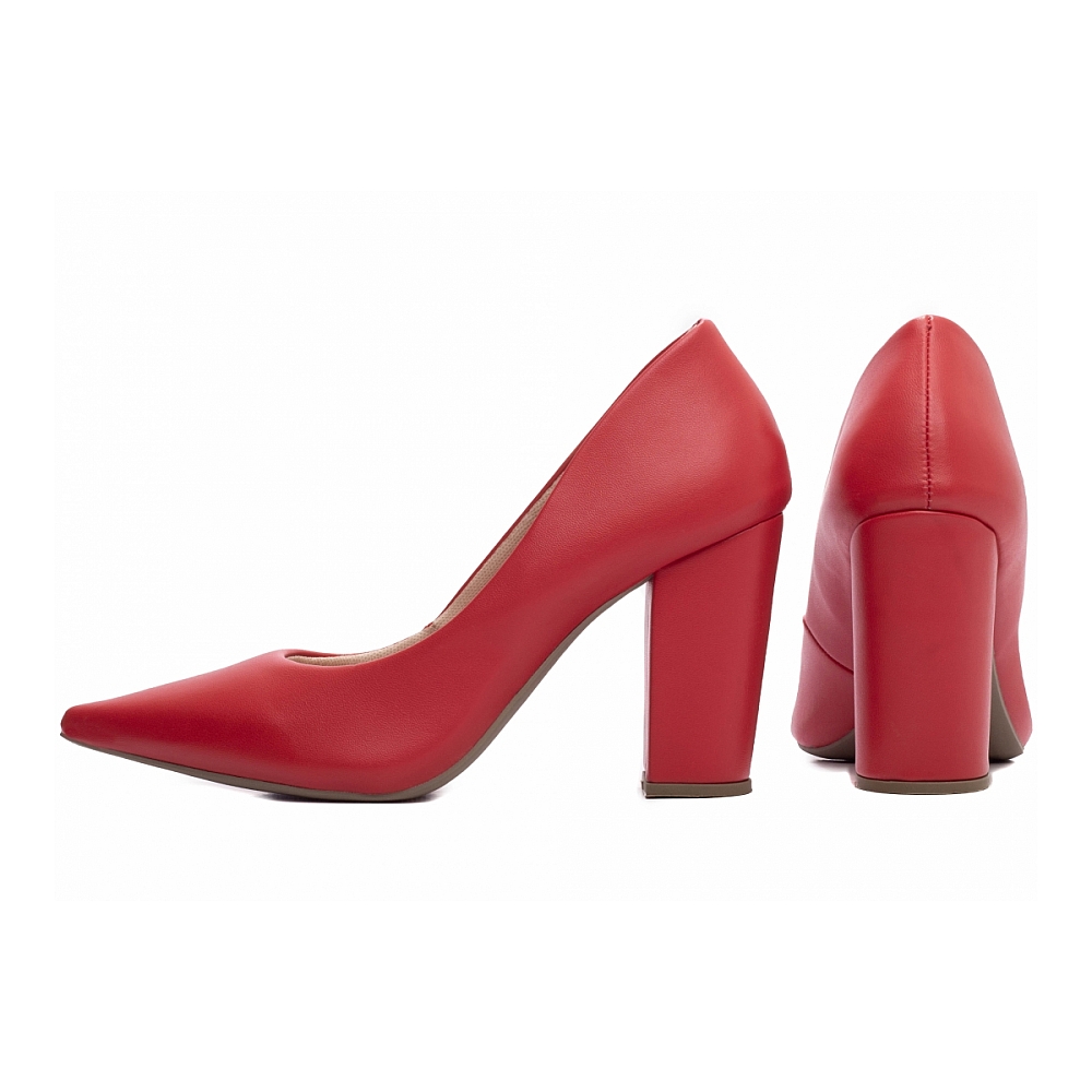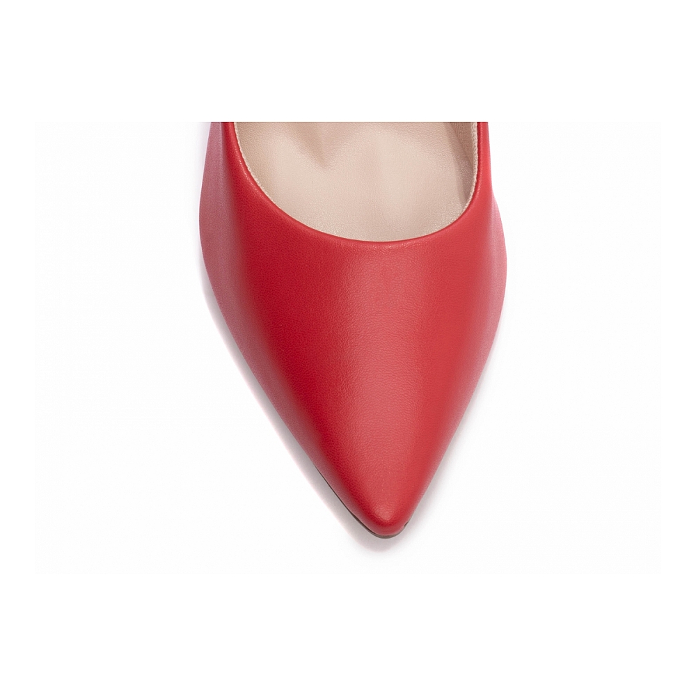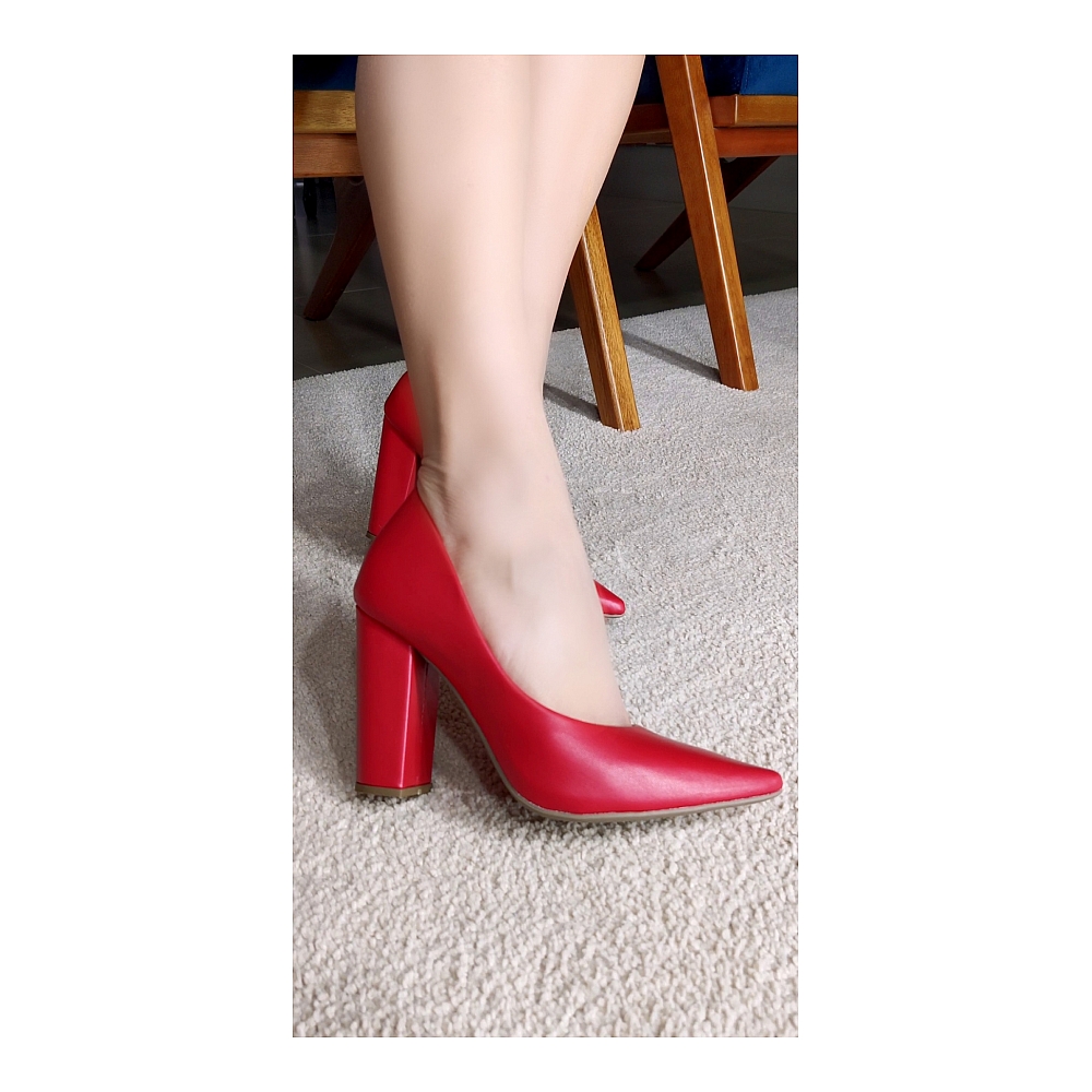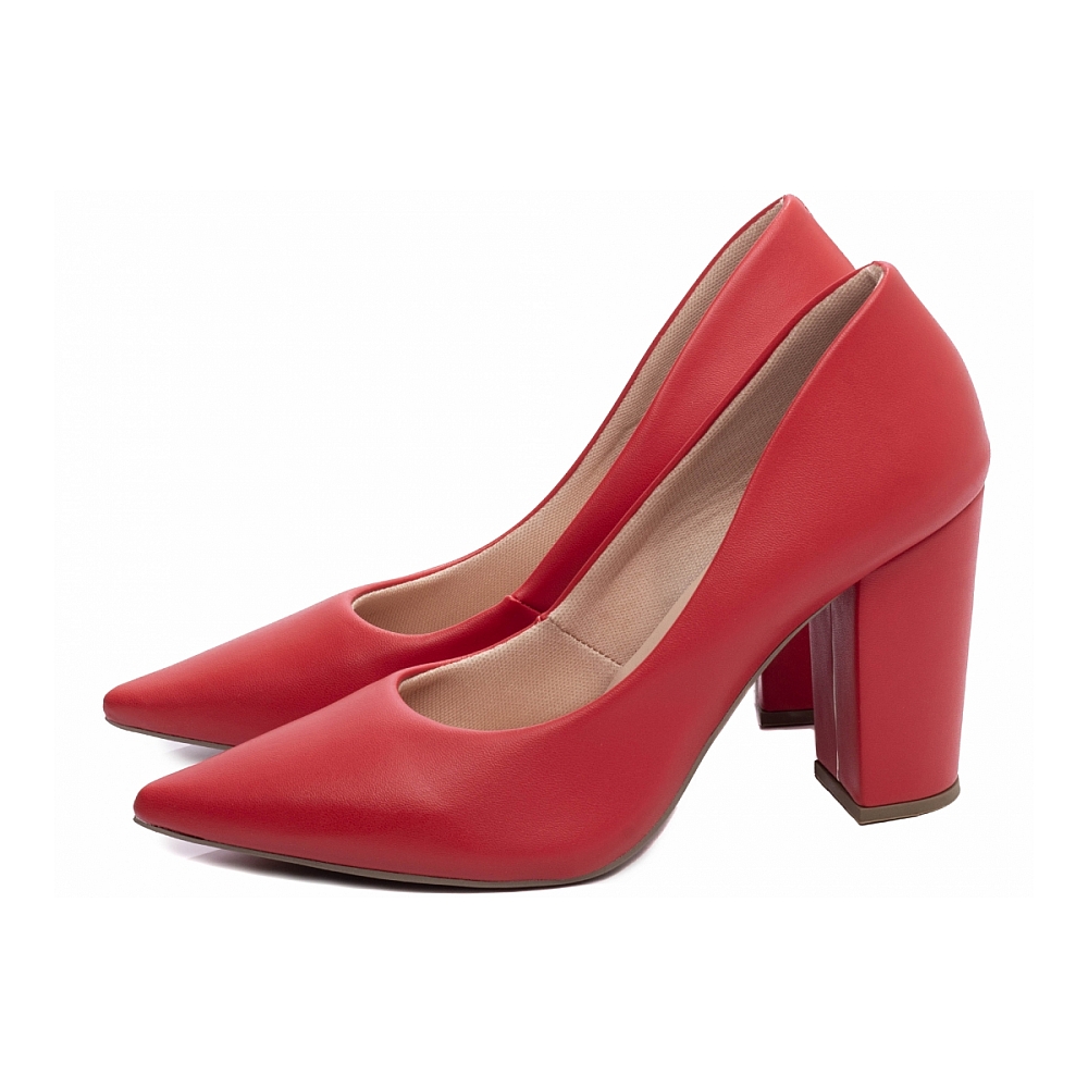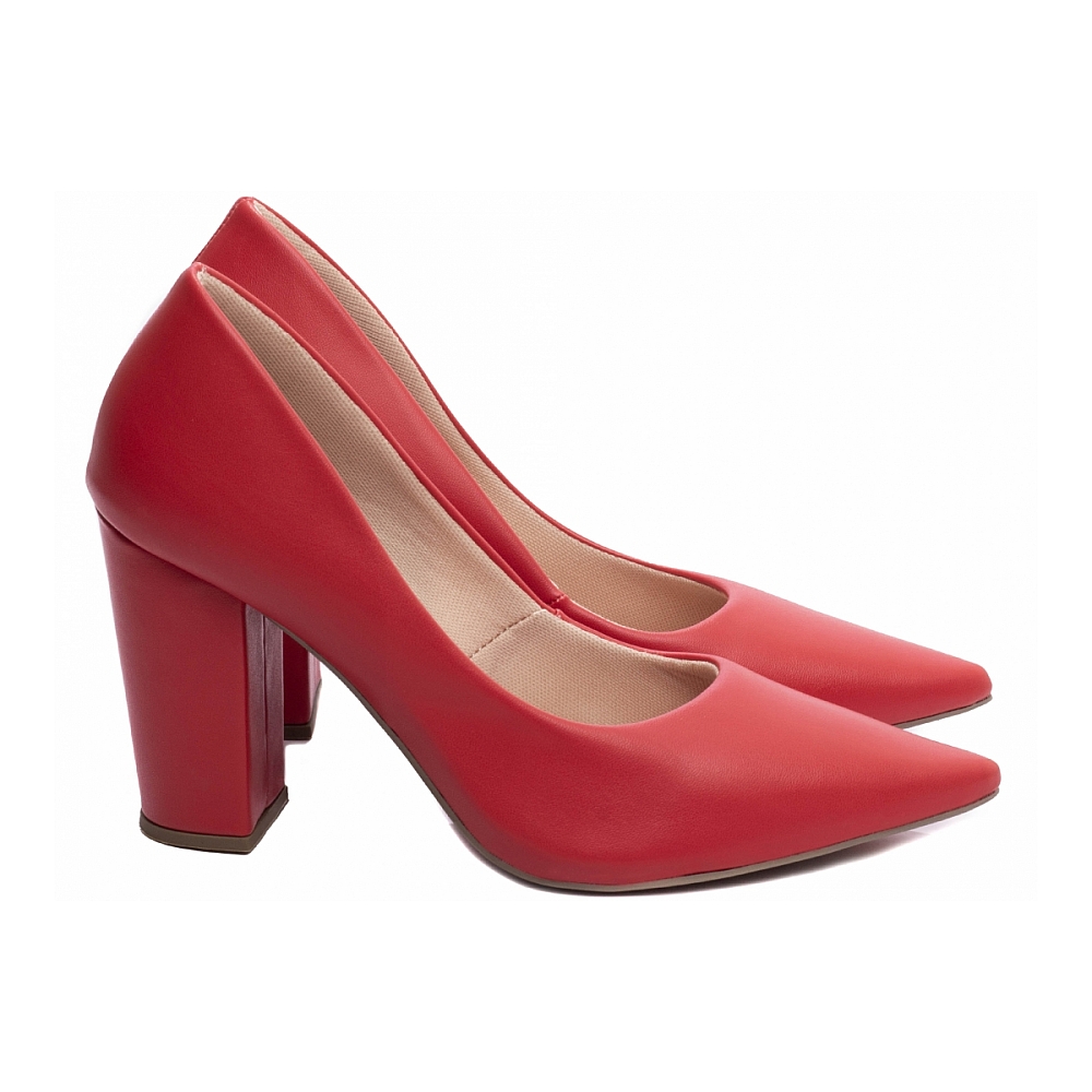 Material: Napa Vermelho; Palmilha: com 8 mm de Espessura, Espuma em EVA, e Taloneira Napa Bege; Forro: Cacharrel, material espumado para maior conforto, na cor Bege; Salto: 9 cm de Altura encapado em Napa Vermelho; Solado de PVC antiderrapante na cor Bege.