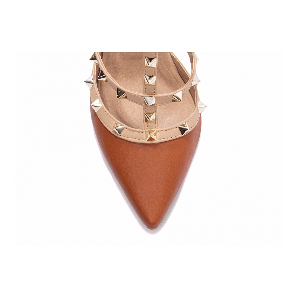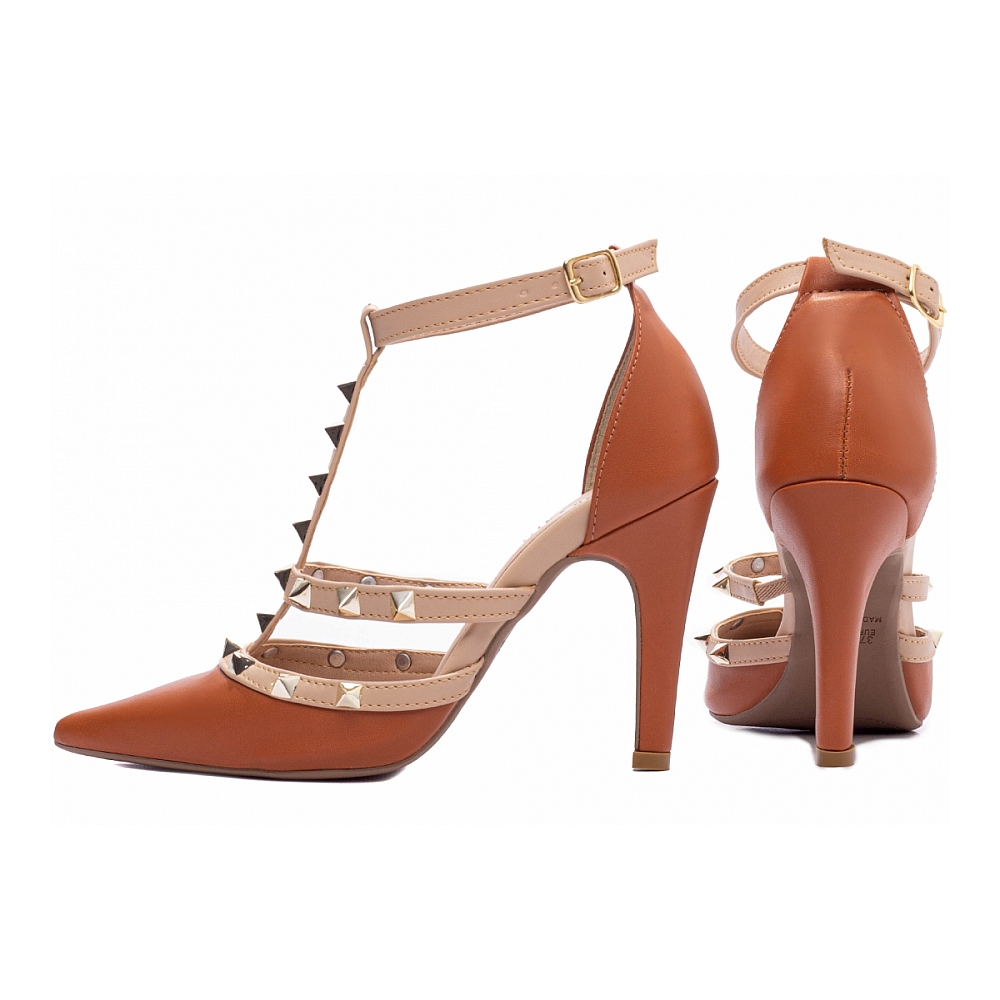 Material: Napa Caramelo e Napa Bege; Palmilha: 8 mm de Espessura, Espuma em EVA, Revestida em Napa Bege Taloneira Napa Bege; Enfeite: Pirâmide Dourado; Salto: 9 cm de Altura Revestido em Napa Caramelo; Solado de TR coletado na cor Bege.