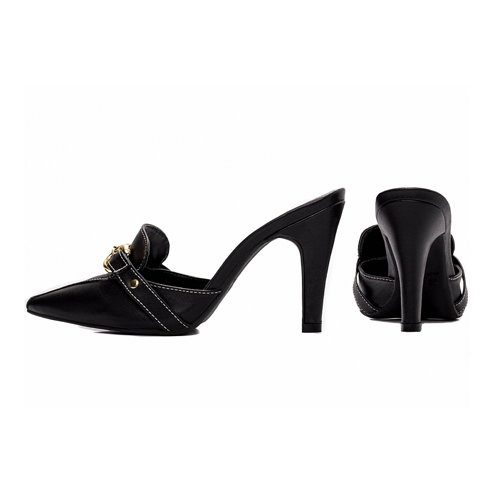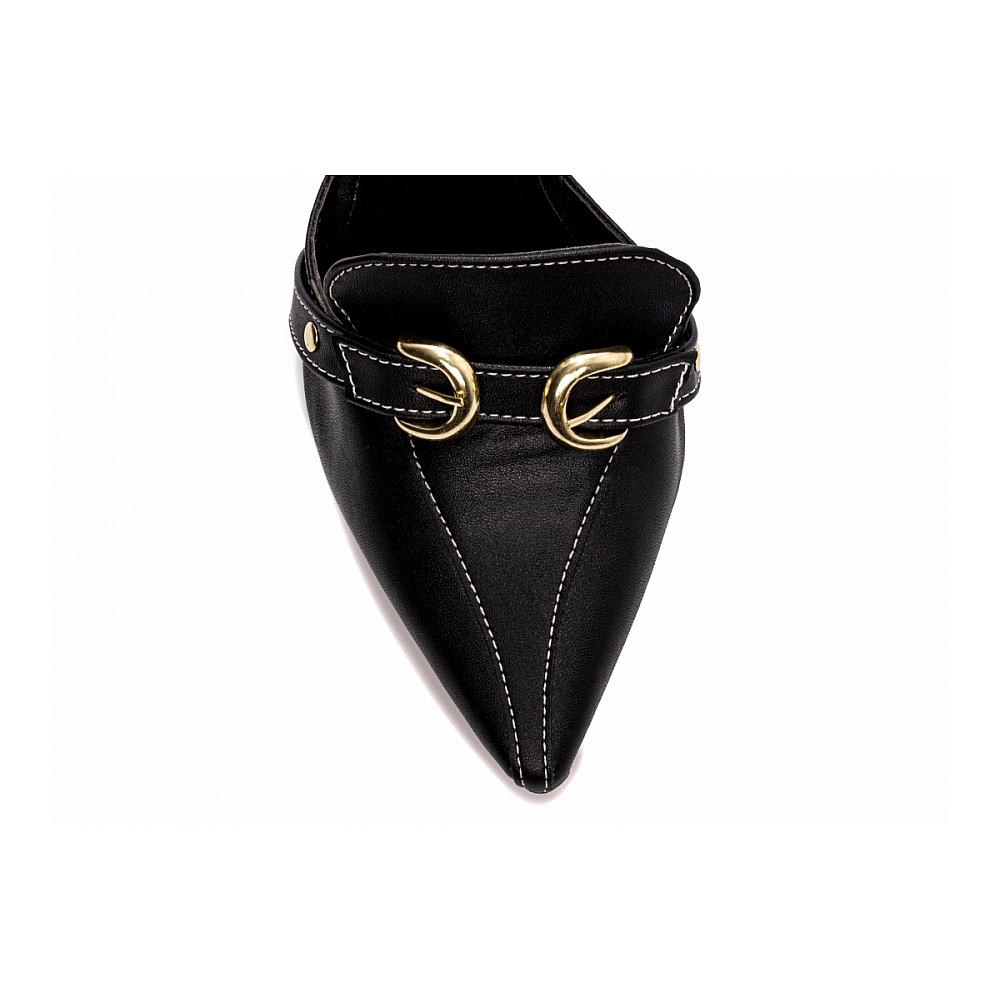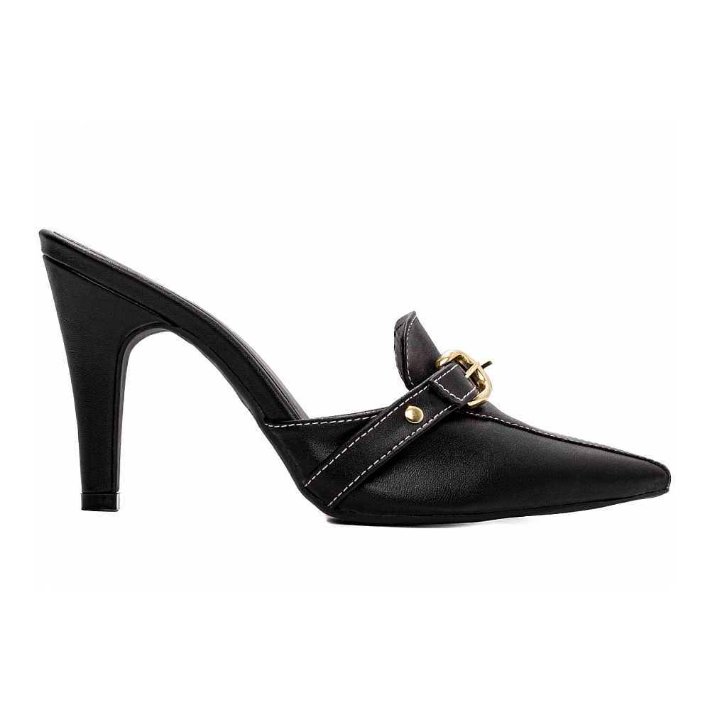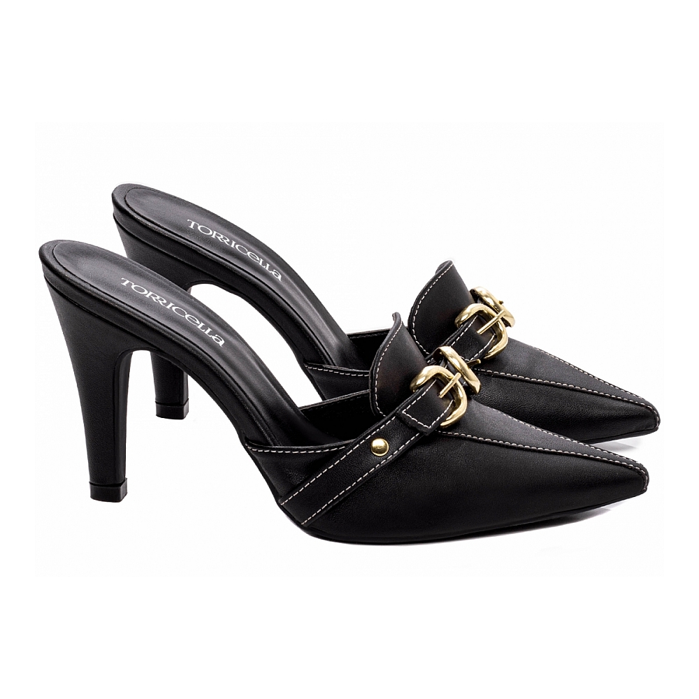 Material: Napa Preto; Palmilha: 8 mm de Espessura, Espuma em EVA, Revestida em Napa Preto e Taloneira Napa Preto; Enfeite: Fivelas e Apliques na Cor Dourado; Salto: 9 cm de Altura Revestido em Napa Preto; Solado de TR na cor Preto.