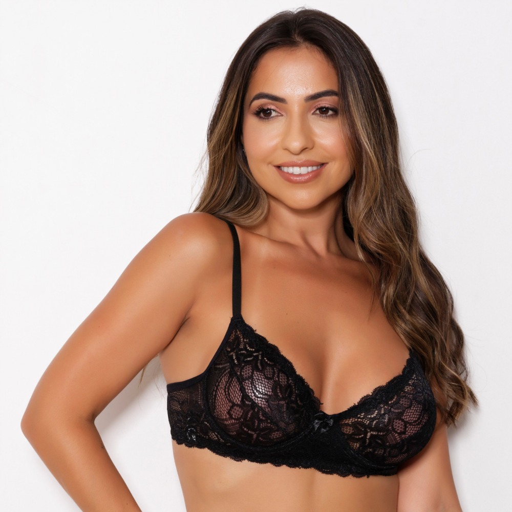 Confeccionado em renda delicada de poliamida, possui arco, alças ajustáveis e colchetes duplo para melhor ajuste ao corpo.
